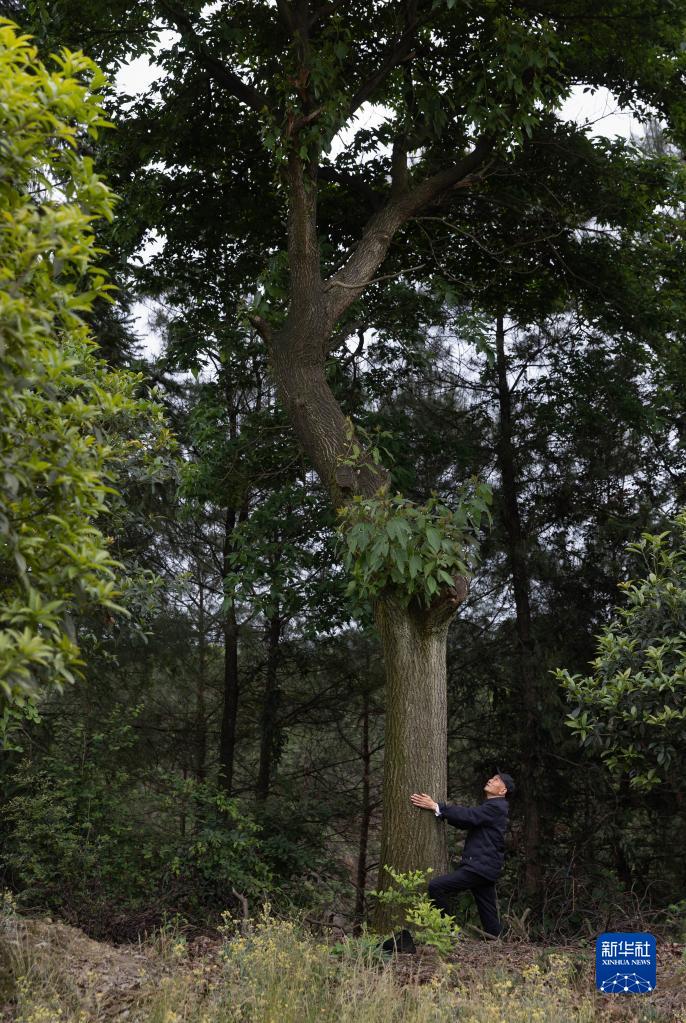 5月14日,在四川省榮縣東興鎮長(cháng)興林場(chǎng),李秀雄抱著(zhù)一棵粗壯的檫樹(shù),這是他最初種樹(shù)時(shí)候移栽的。