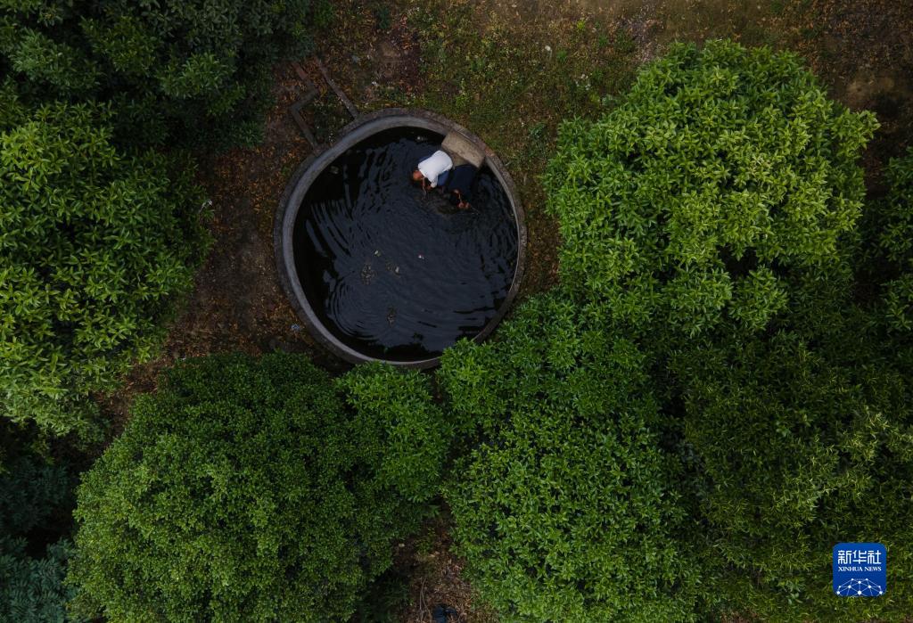 5月14日,在四川省榮縣東興鎮長(cháng)興林場(chǎng),李光金(李秀雄二兒子)和一名工人在水池中洗手。李秀雄一家在山上修建了2個(gè)水塘、20多個(gè)水池以供生產(chǎn)用水。