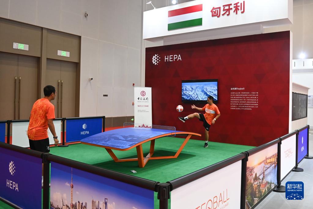 5月16日,在中東歐展館匈牙利館,運動(dòng)員在展示臺科搏運動(dòng)。這是起源于匈牙利的桌式足球運動(dòng)。