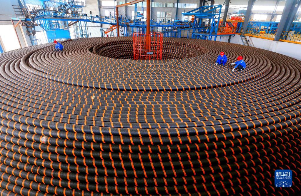 5月15日,在青島漢纜股份有限公司海纜生產(chǎn)基地,工人在生產(chǎn)用于海上風(fēng)力發(fā)電及石油平臺等大型海洋工程建設設施的海纜產(chǎn)品。