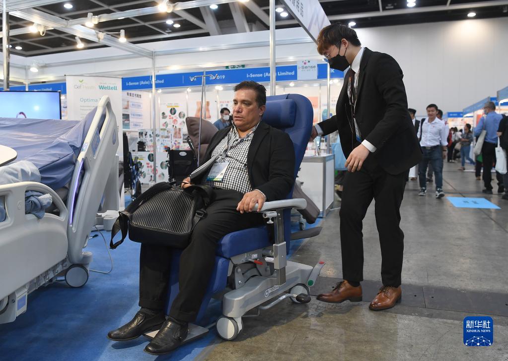 5月16日,一名買(mǎi)家在第十四屆“香港國際醫療及保健展”上體驗一款“可傾斜升降高背椅”。