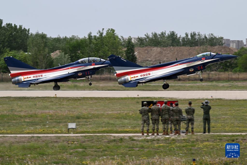 空軍八一飛行表演隊殲-10C(右)和殲-10S(左)表演機編隊起飛,開(kāi)展訓練(5月6日攝)。