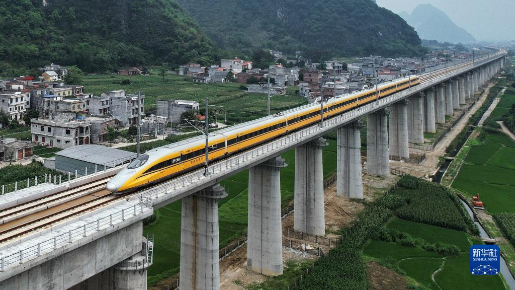 5月16日,高速綜合檢測列車(chē)行駛在貴南高鐵上進(jìn)行檢測工作(無(wú)人機照片)。