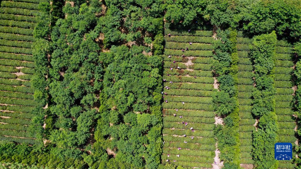 5月16日,在五蓮縣叩官鎮一處茶場(chǎng),茶農在采摘茶鮮葉(無(wú)人機照片)。