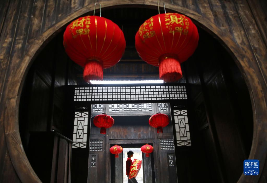 村民在湖南省常寧市中田村古民居內貼對聯(lián)(3月3日攝)。