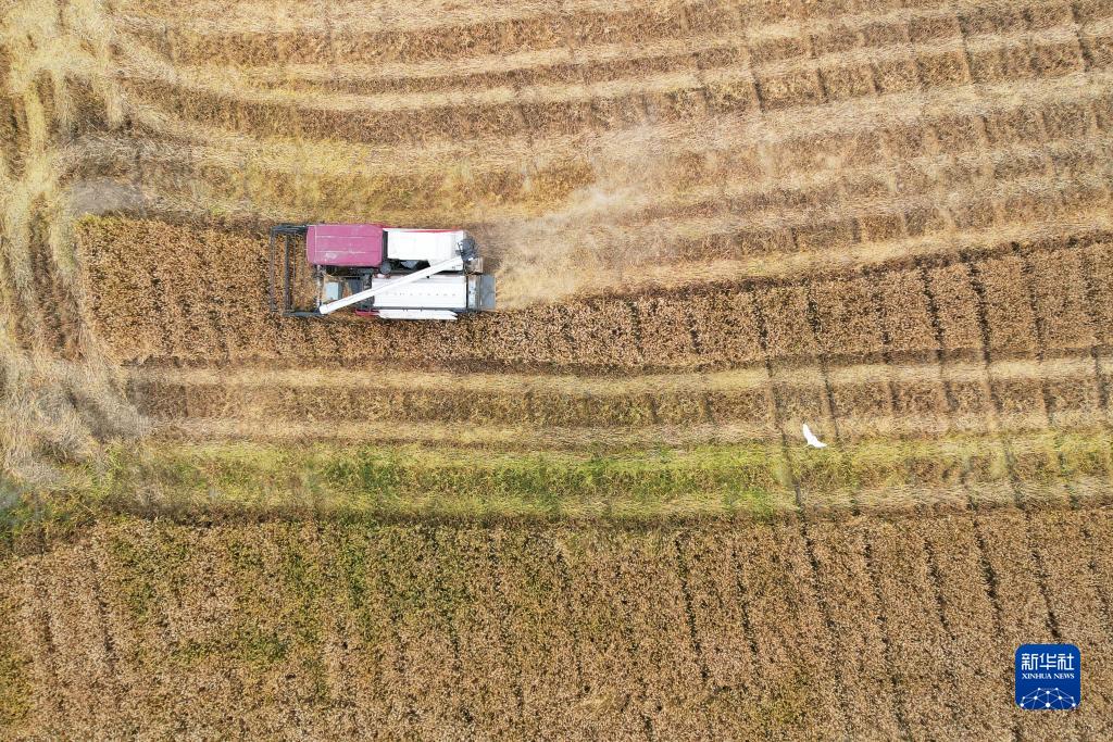 5月16日,杭州市蕭山區盈豐街道的麥田里,農機手駕駛收割機收小麥(無(wú)人機照片)。近日,杭州蕭山區盈豐街道的數千畝小麥迎來(lái)收獲季。