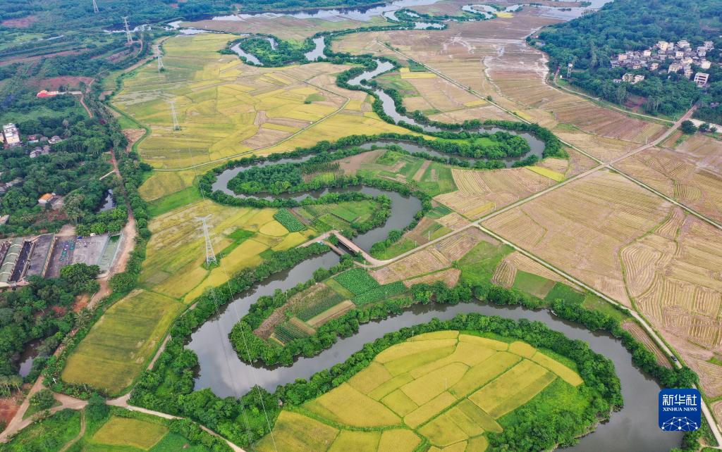 5月以來(lái),位于??谑腥獌砂兜乃具M(jìn)入夏收時(shí)節,一片片成熟的稻田與蜿蜒曲折的河道交織,勾勒出一幅美麗的畫(huà)卷。
