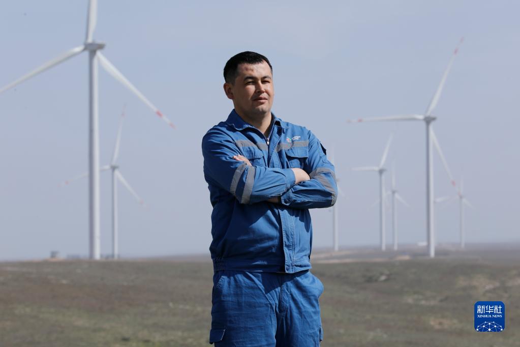 4月3日,在哈薩克斯坦札納塔斯,阿比爾加濟耶夫站在風(fēng)電項目風(fēng)機前。