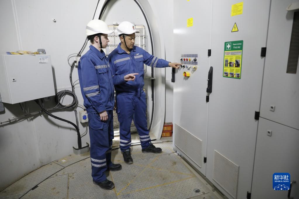 4月3日,在哈薩克斯坦札納塔斯,阿比爾加濟耶夫(右)與同事在風(fēng)機內部工作。