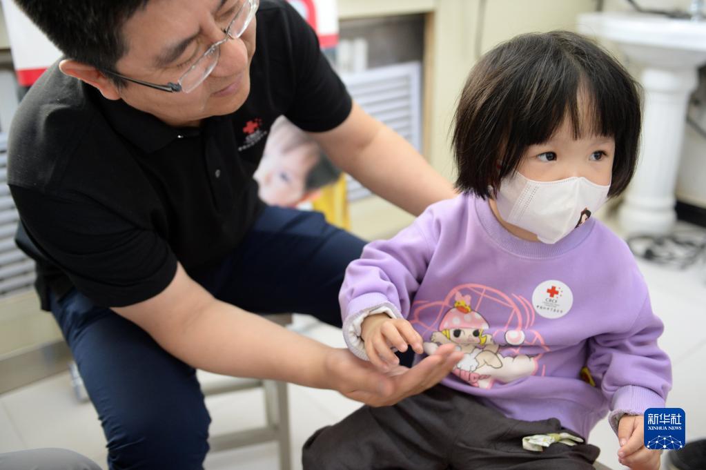 5月15日,在和田市維吾爾醫醫院,中國紅十字基金會(huì )工作人員幫助一名小朋友做檢查。