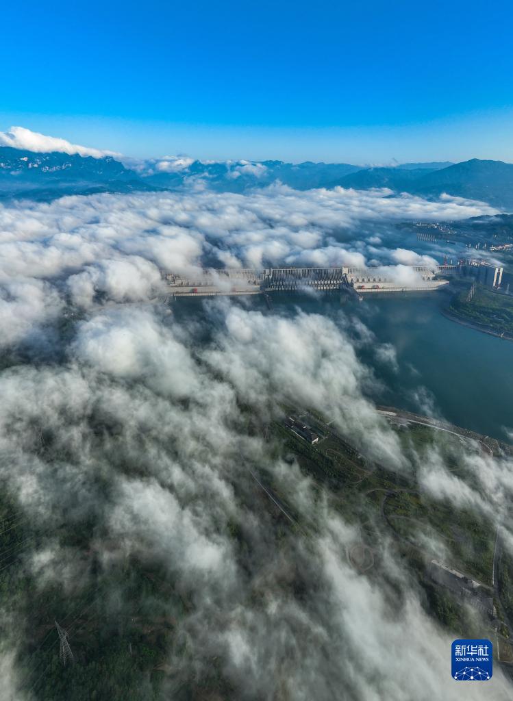 當日,湖北宜昌雨過(guò)天晴,三峽上空云霧繚繞,美景如畫(huà)。