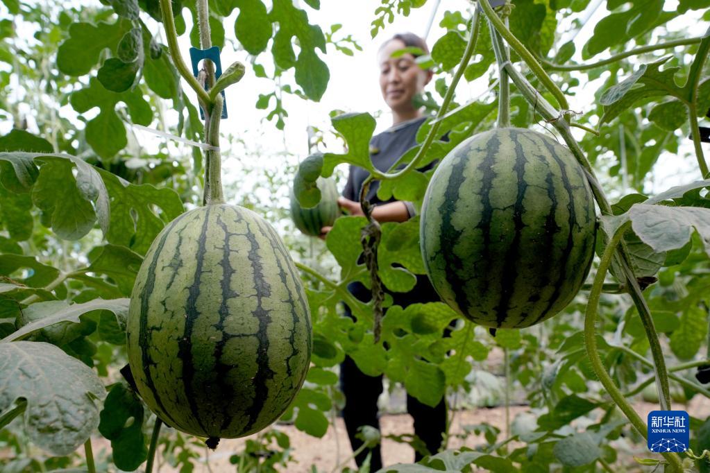 5月17日,河北省柏鄉縣春禾家庭農場(chǎng)工作人員采收吊秧西瓜。