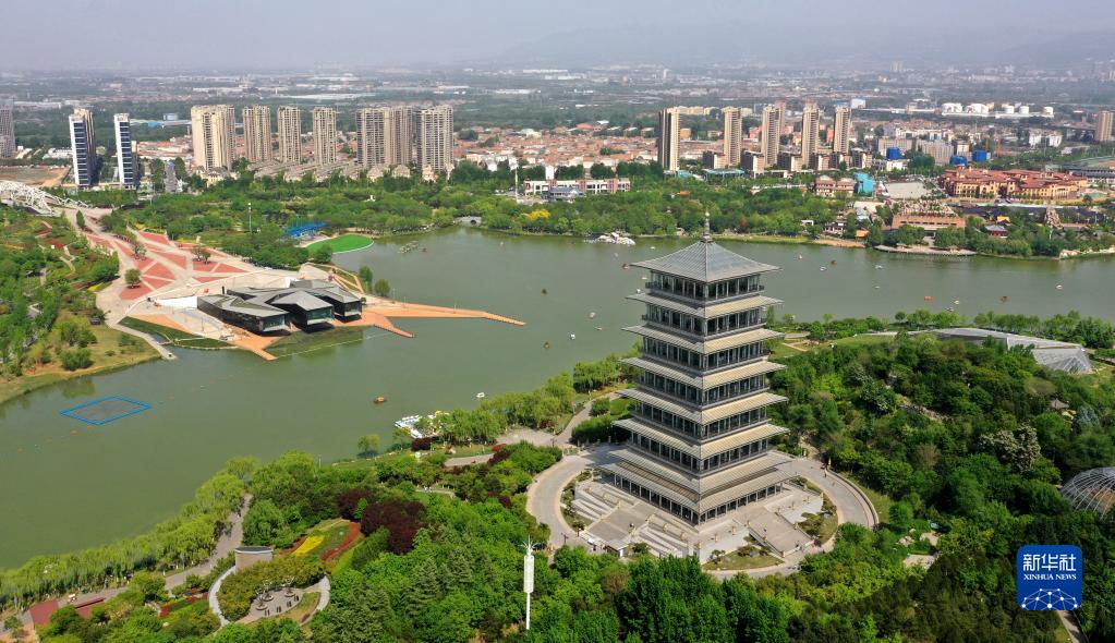 位于西安浐灞生態(tài)區的長(cháng)安塔(4月16日攝,無(wú)人機照片)。