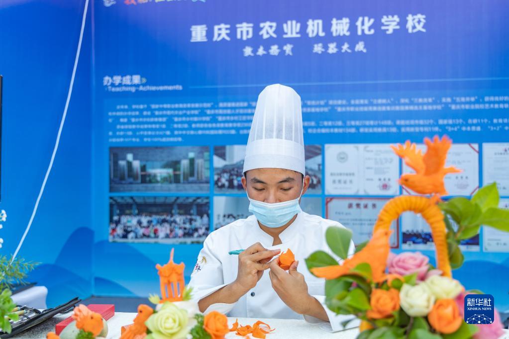 5月17日,在重慶市永川區舉行的2023年成渝地區雙城經(jīng)濟圈職業(yè)教育活動(dòng)周辦學(xué)成果展上,重慶市農業(yè)機械化學(xué)校學(xué)生崔志軍在現場(chǎng)展示食品雕花技藝。