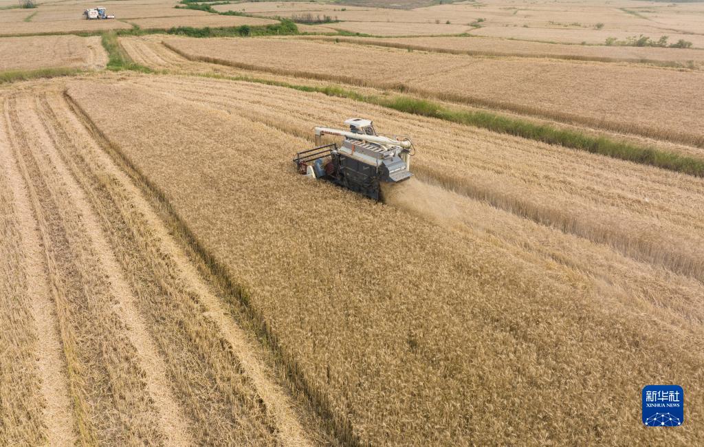 5月17日,在廣漢市小漢鎮團結村,收割機在收割小麥(無(wú)人機照片)。