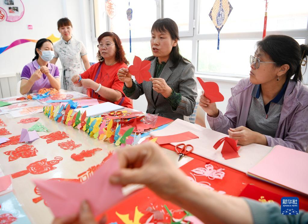 5月17日,老師(右二)向居民傳授剪紙技藝。