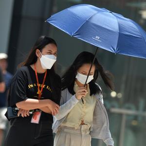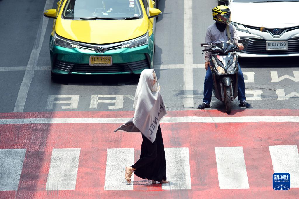 5月17日,行人在泰國曼谷街頭用圍巾遮陽(yáng)。