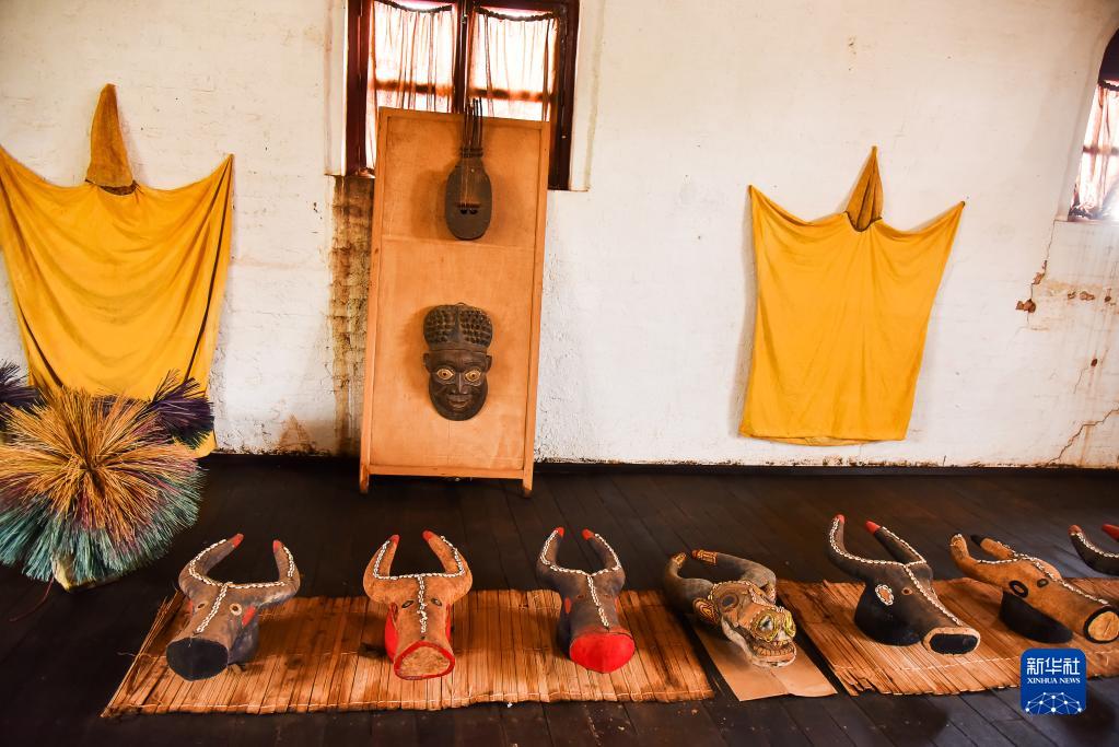 這是4月12日在喀麥隆西部大區豐班拍攝的巴蒙王宮博物館內展示的面具和服裝。