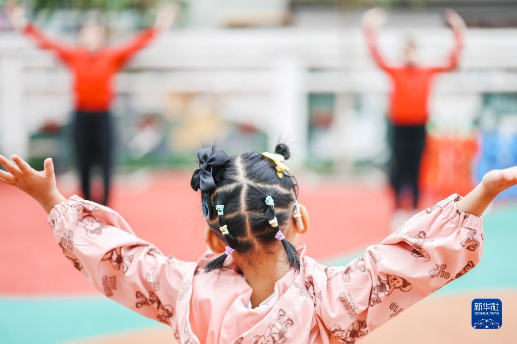 在吉林省聾兒語(yǔ)言聽(tīng)力康復中心,一名小朋友在教師指引下做課間操(5月17日攝)。