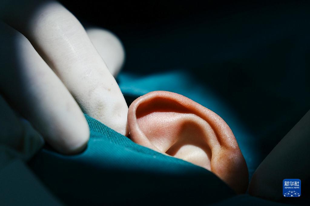 在吉林大學(xué)白求恩第一醫院,醫護人員在完成人工耳蝸植入手術(shù)后檢查患兒切口縫合情況(5月15日攝)。