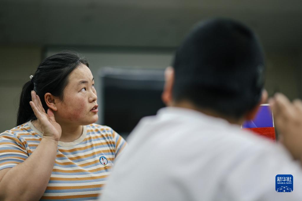 在吉林長(cháng)春,一名家長(cháng)在孩子人工耳蝸首次開(kāi)機調試時(shí)將手放在耳朵邊,向孩子示意“是否能夠聽(tīng)到聲音?”(5月15日攝)。