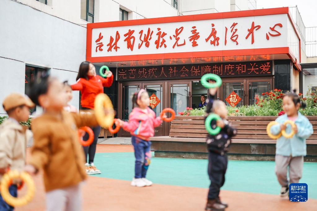 在吉林省聾兒語(yǔ)言聽(tīng)力康復中心,家長(cháng)觀(guān)看小朋友做響鈴課間操(5月17日攝)。