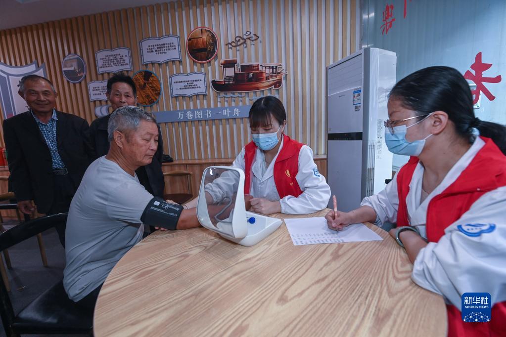 5月18日,志愿者在織里鎮晟舍村居家養老服務(wù)中心為老人進(jìn)行健康體檢。