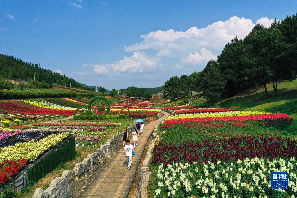 5月17日,游客在貴州省麻江縣宣威鎮藥谷江村賞花(無(wú)人機照片)。