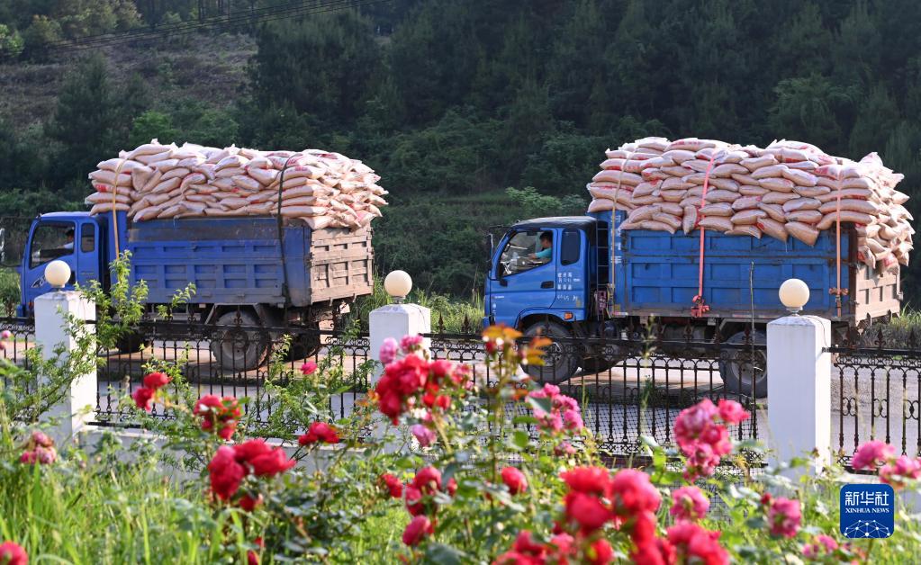 5月17日,飼料運送車(chē)輛在貴州省黔東南苗族侗族自治州黃平縣谷隴鎮肉牛養殖基地大門(mén)口排隊等候入場(chǎng)。