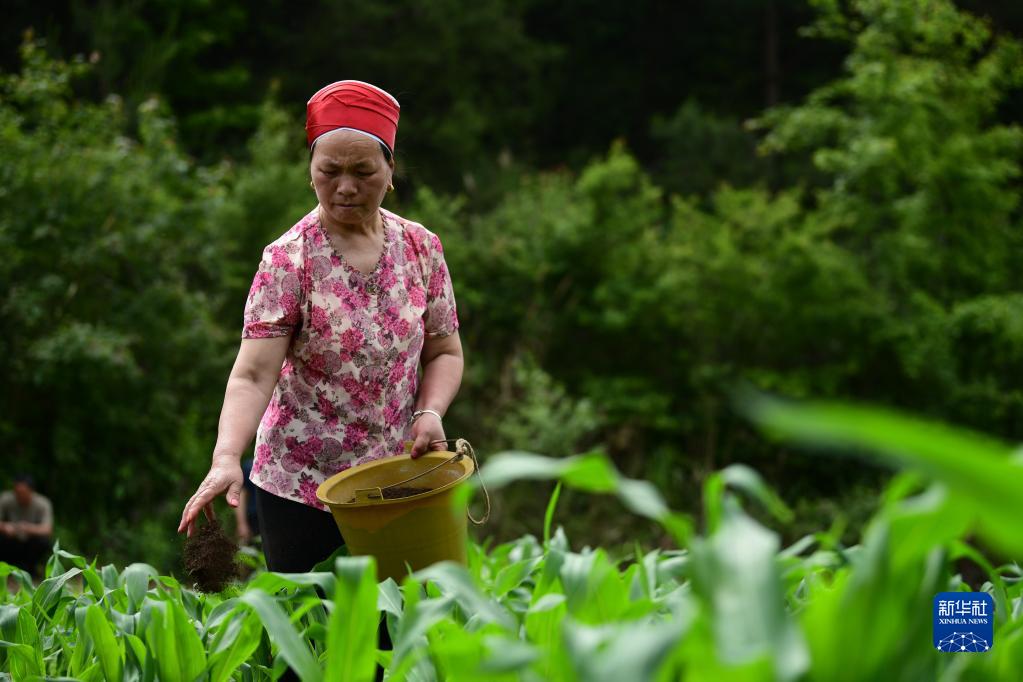 5月18日,村民在貴州省黔東南苗族侗族自治州黃平縣谷隴鎮翁勇村給玉米施牛糞發(fā)酵的有機肥。