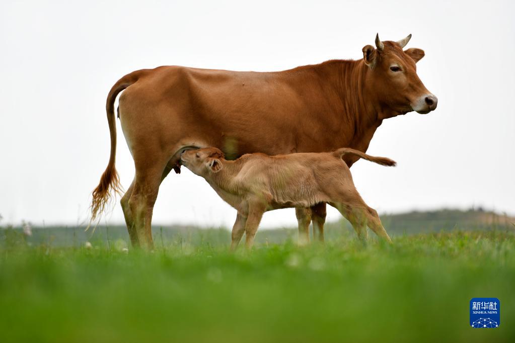 5月17日,貴州省黔東南苗族侗族自治州黃平縣重安鎮冷坪山草場(chǎng),一頭牛犢正在吃奶。