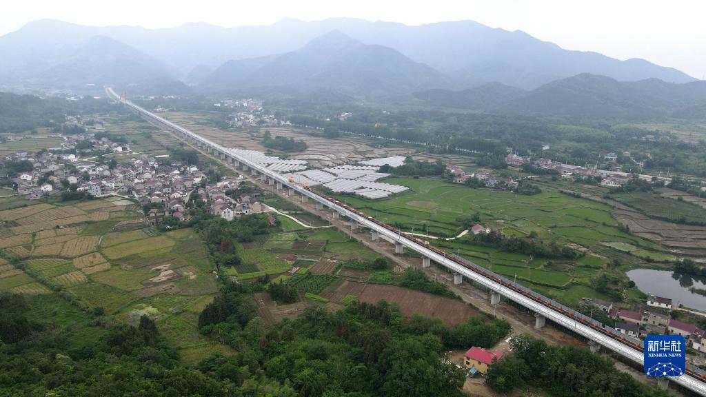 這是中鐵十一局池黃鐵路鋪軌施工現場(chǎng)(5月18日攝,無(wú)人機照片)。