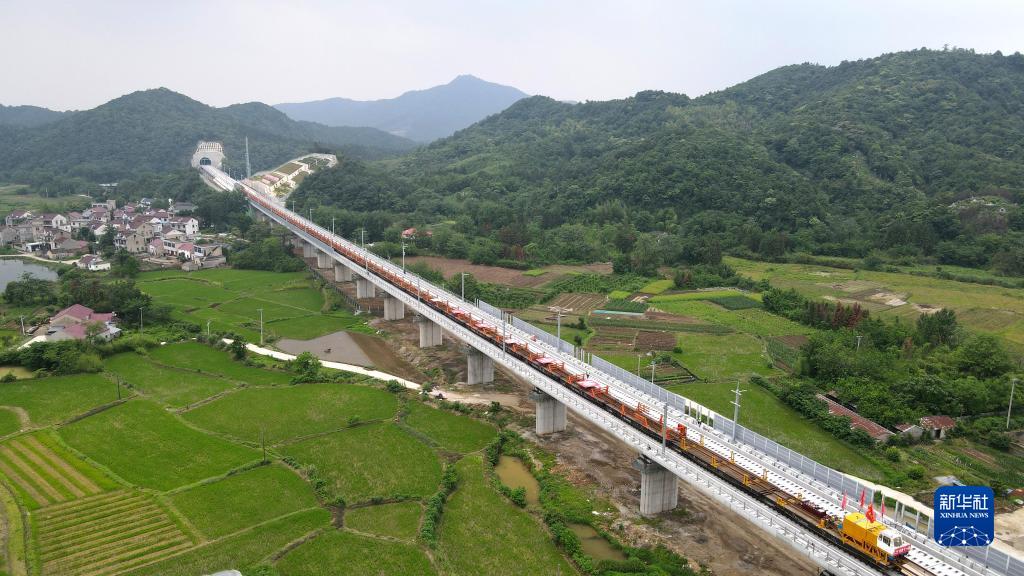 這是中鐵十一局池黃鐵路鋪軌施工現場(chǎng)(5月18日攝,無(wú)人機照片)。