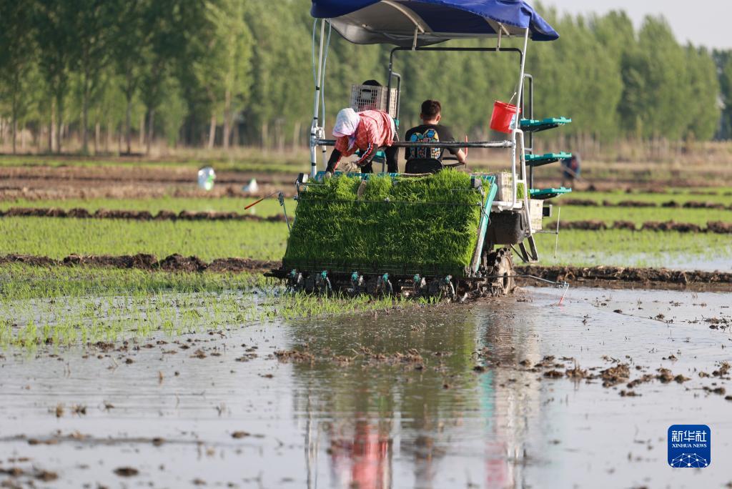 5月18日,河北唐山豐南區岔河鎮楊義口頭一村農民在水稻田使用農機插秧。