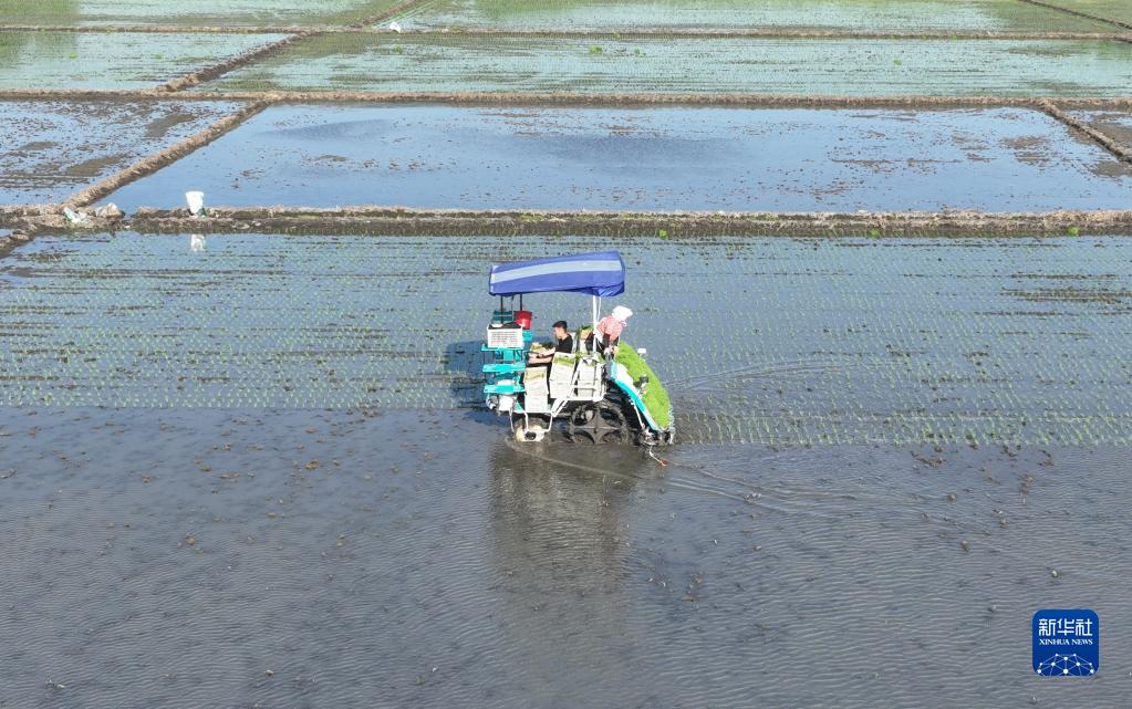 5月18日,河北唐山豐南區岔河鎮楊義口頭一村農民在水稻田使用農機插秧(無(wú)人機照片)。