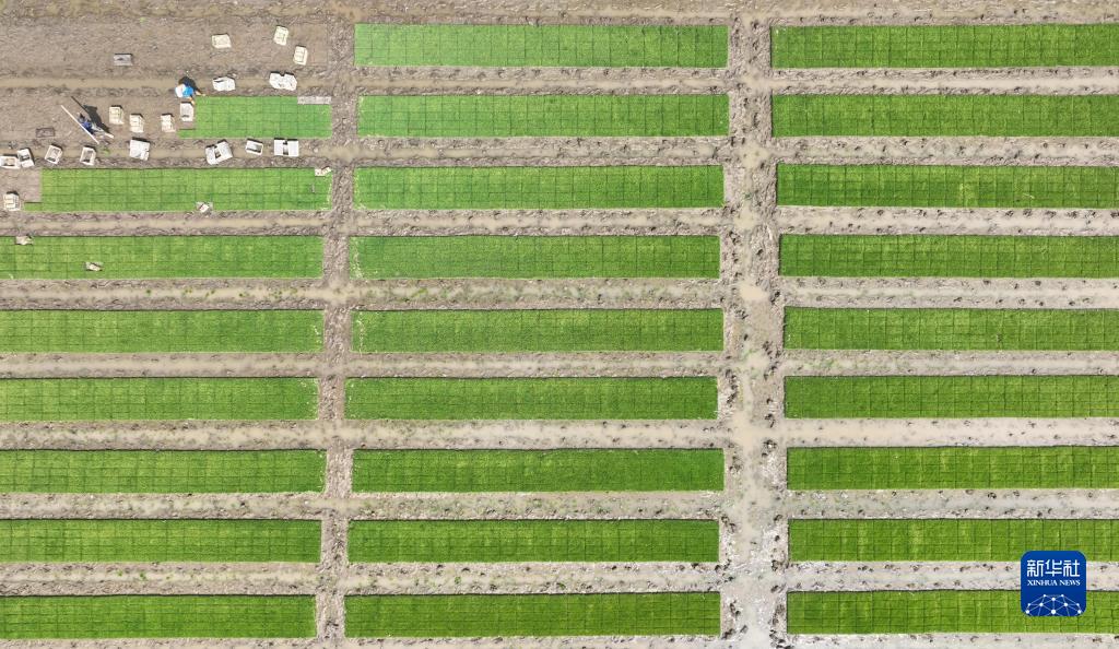 5月18日,河北唐山豐南區岔河鎮楊義口頭一村農民在水稻秧苗田起秧(無(wú)人機照片)。