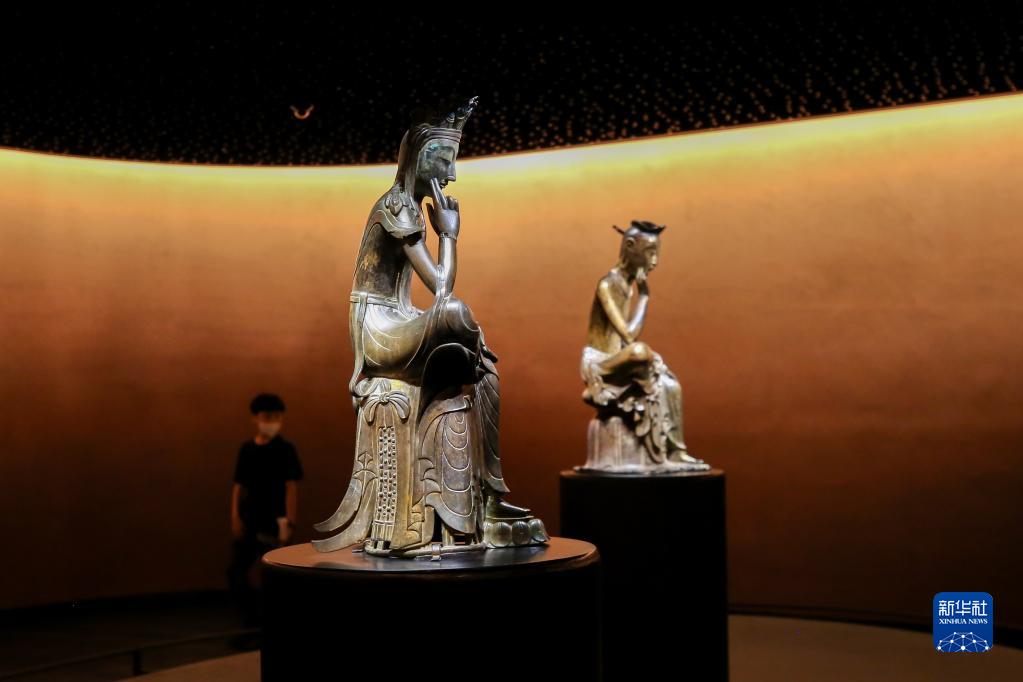 5月18日,在韓國首爾國立中央博物館,游客在思惟展廳參觀(guān)韓國國寶“半跏思惟像”。