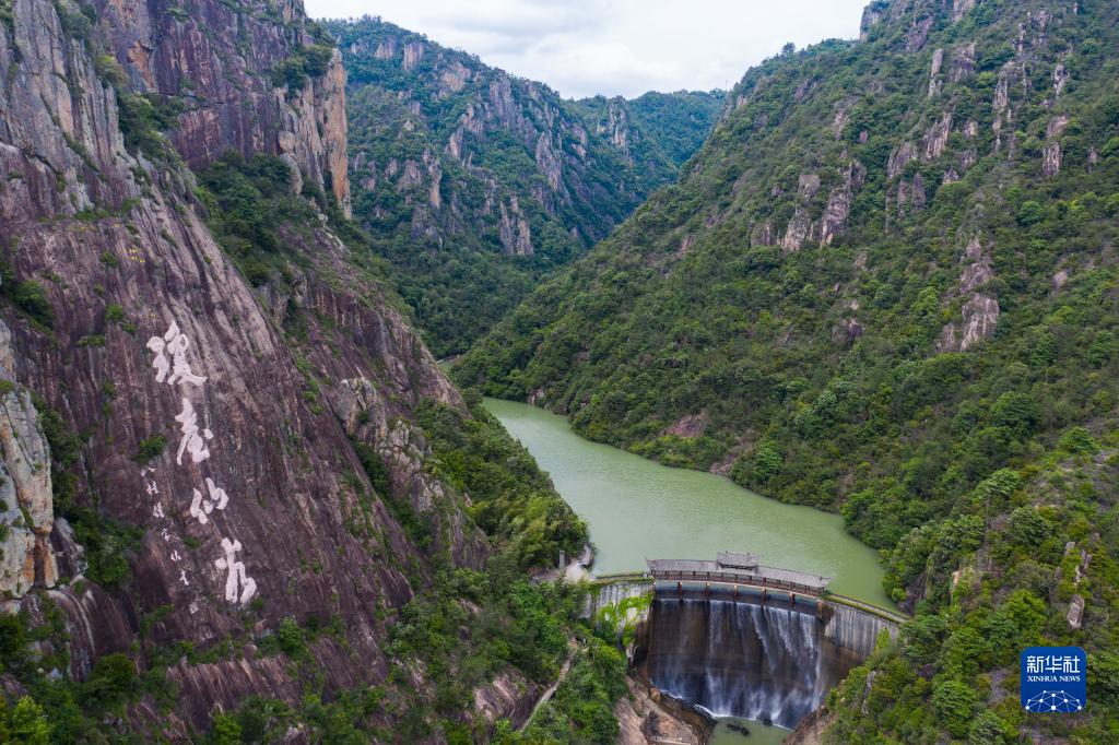 天臺山瓊臺仙谷景區(5月16日攝,無(wú)人機照片)。徐霞客在游記中寫(xiě)道:“峰頭中斷,即為雙闕;雙闕所夾而環(huán)者,即為瓊臺?!?/p>