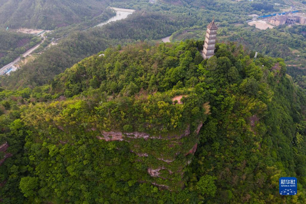 俯瞰天臺縣的赤城山及山頂的梁妃塔(5月16日攝,無(wú)人機照片)。