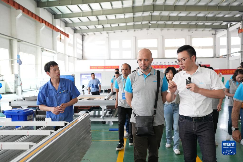 5月18日,在臨海拓卡奔馬機電科技有限公司,海外戰略經(jīng)銷(xiāo)商代表在參觀(guān)裁床生產(chǎn)線(xiàn)。
