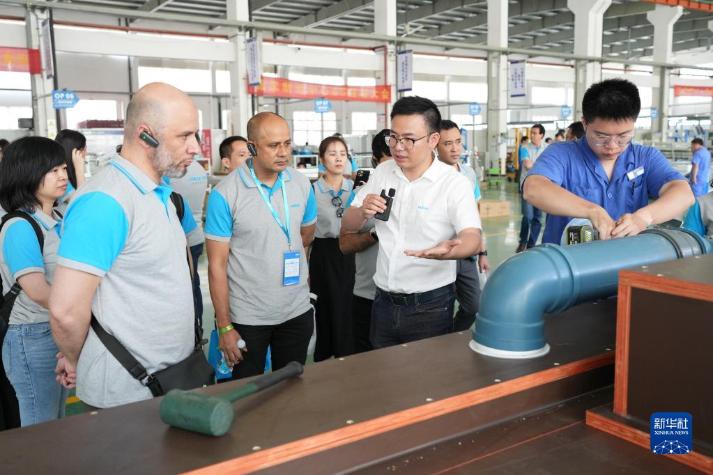 5月18日,在臨海拓卡奔馬機電科技有限公司,海外戰略經(jīng)銷(xiāo)商代表在參觀(guān)裁床生產(chǎn)線(xiàn)。