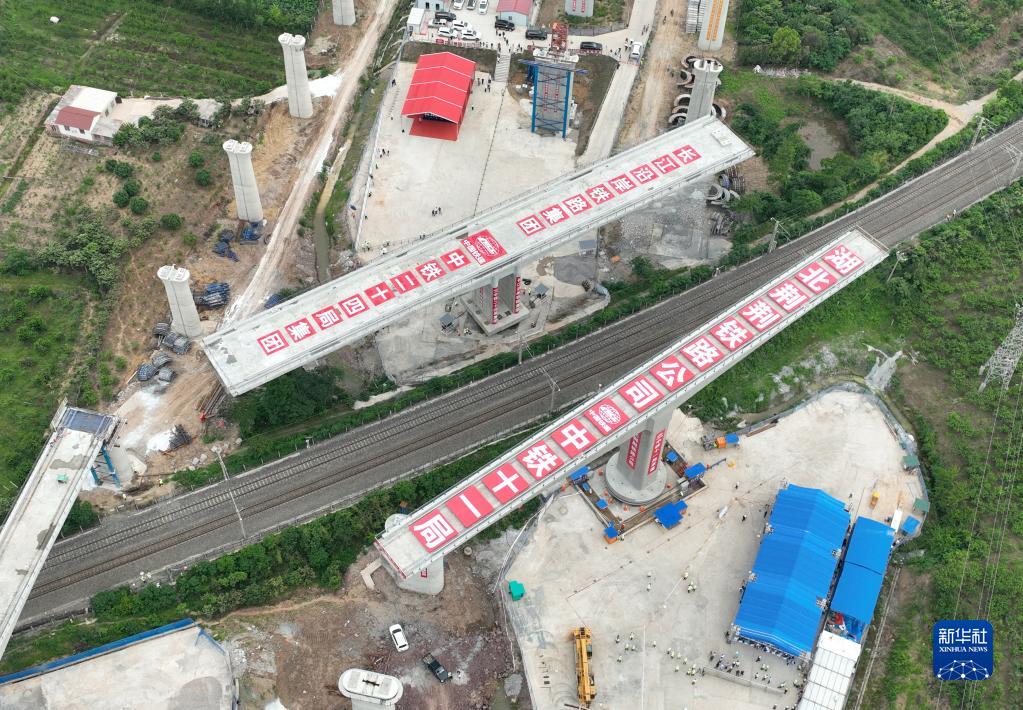 5月18日,荊荊高鐵荊門(mén)特大橋轉體梁與滬渝蓉高鐵太白集特大橋轉體梁,分別實(shí)現成功對接,跨越焦柳鐵路。