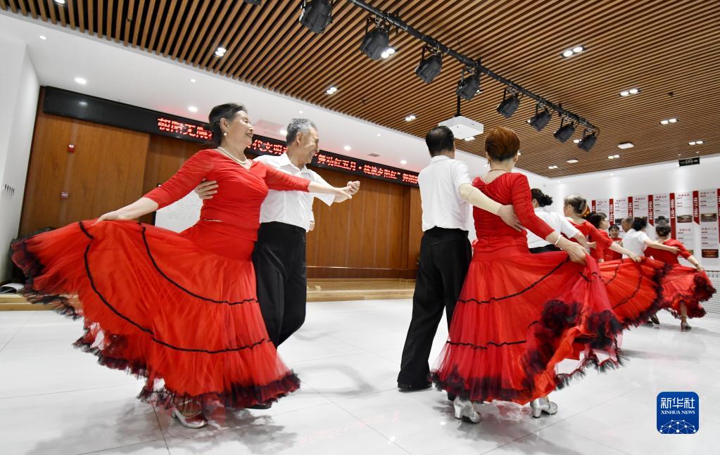 朝陽(yáng)無(wú)限社區的老年人舞蹈隊在社區黨群活動(dòng)中心排練舞蹈(5月17日攝)。