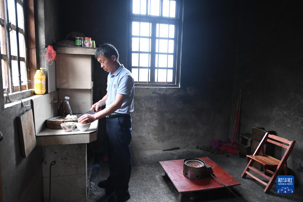 5月18日,在廣西靈川縣蘭田瑤族鄉深潭教學(xué)點(diǎn),趙洪老師在學(xué)校食堂里做自己的午飯。