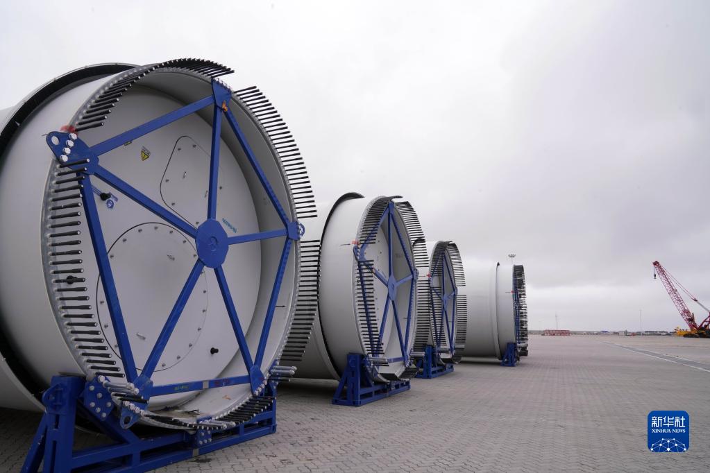5月18日在江蘇如東小洋口風(fēng)電母港拍攝的風(fēng)電設施組件。