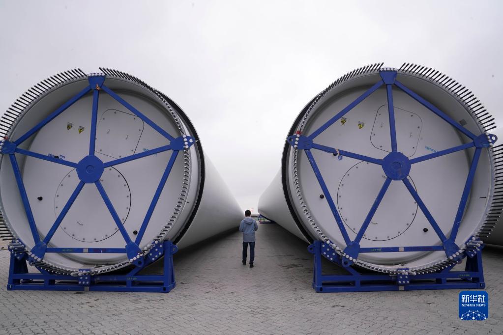 5月18日在江蘇如東小洋口風(fēng)電母港拍攝的風(fēng)電設施組件。