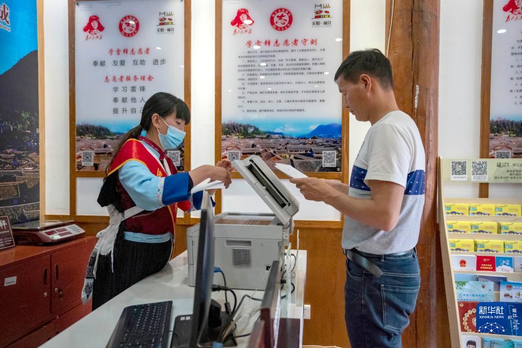 5月18日,一名志愿者(左)在麗江古城學(xué)雷鋒志愿服務(wù)點(diǎn)為游客提供免費的復印服務(wù)。