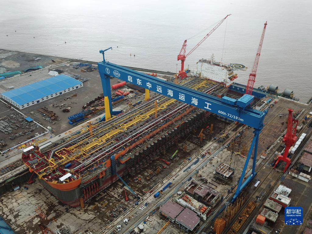5月19日在江蘇省南通市啟東海工船舶工業(yè)園拍攝的,啟東中遠海運海洋工程有限公司正在建造的世界最大噸位級新型海上浮式生產(chǎn)儲卸油船(無(wú)人機照片)。