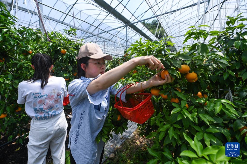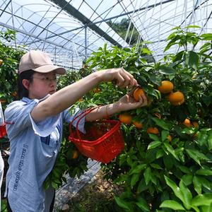 5月19日,游客在建德柑橘科技小院基地大棚內采摘柑橘。