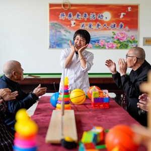 5月19日,河北省灤南縣一家養老機構的工作人員在陪老人做益智游戲。